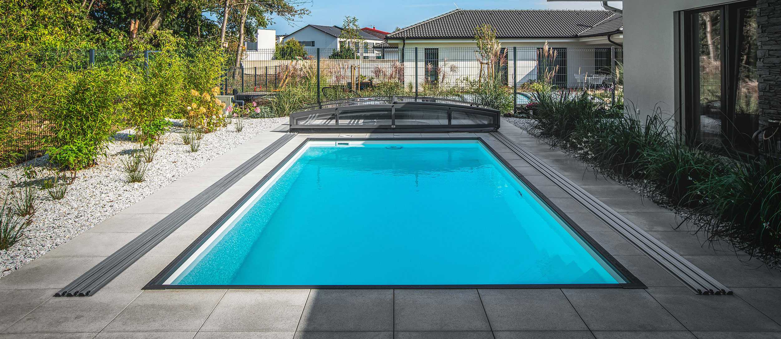 The CASABLANCA INFINITY pool enclosure has become one of our bestsellers. The B. Family appreciates the combination of aesthetic requirements for modern enclosures, which doesn't interfere with the garden's architectural design in any way, with the invaluable benefit of swimming under an open roof. Thanks to the combination of a pool enclosure with a heating pump, the family also extended the bathing season significantly, which was the main reason for their purchase. "The pool enclosure looks great and we can swim for a long time," adds Mr. B.