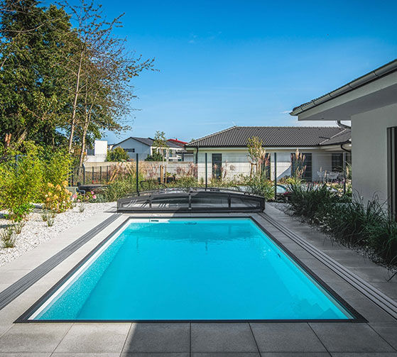 Year after year, and after the demanding arrangement that building a house entails, the dream became reality. And that includes a swimming pool with a minimalist enclosure in the garden. The B. Family was very clear about their pool requirements. They wanted a salt water pool, a countercurrent, a heating pump and a low pool enclosure. All this combined with minimal maintenance, high reliability and quality. Last but not least, the couple wanted a modern design that would harmoniously complement the modern concept of the house and suit the garden gracefully.