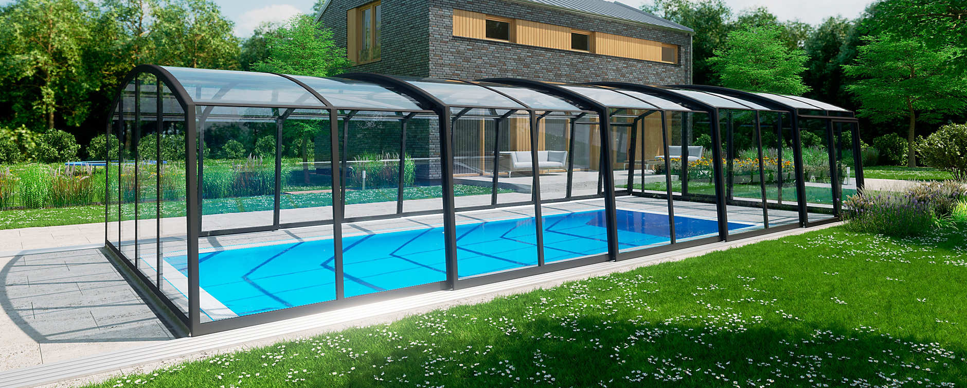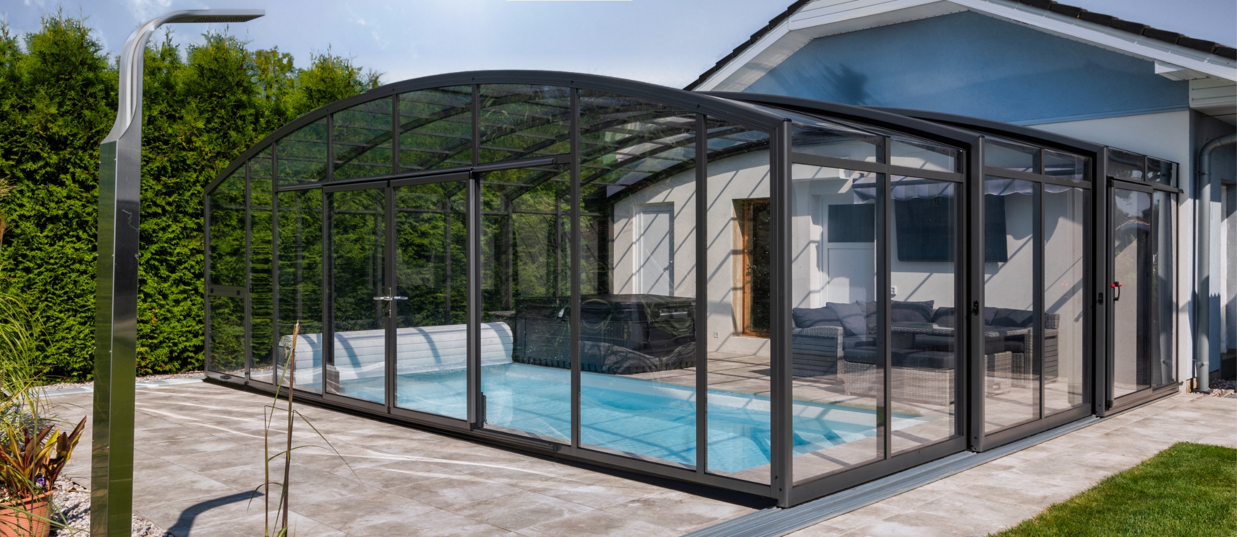 The dominant feature of your garden – that's CASABLANCA pool enclosure. It's not just a worthy pool cover, but also an area that has multifunctional use in all weather conditions.