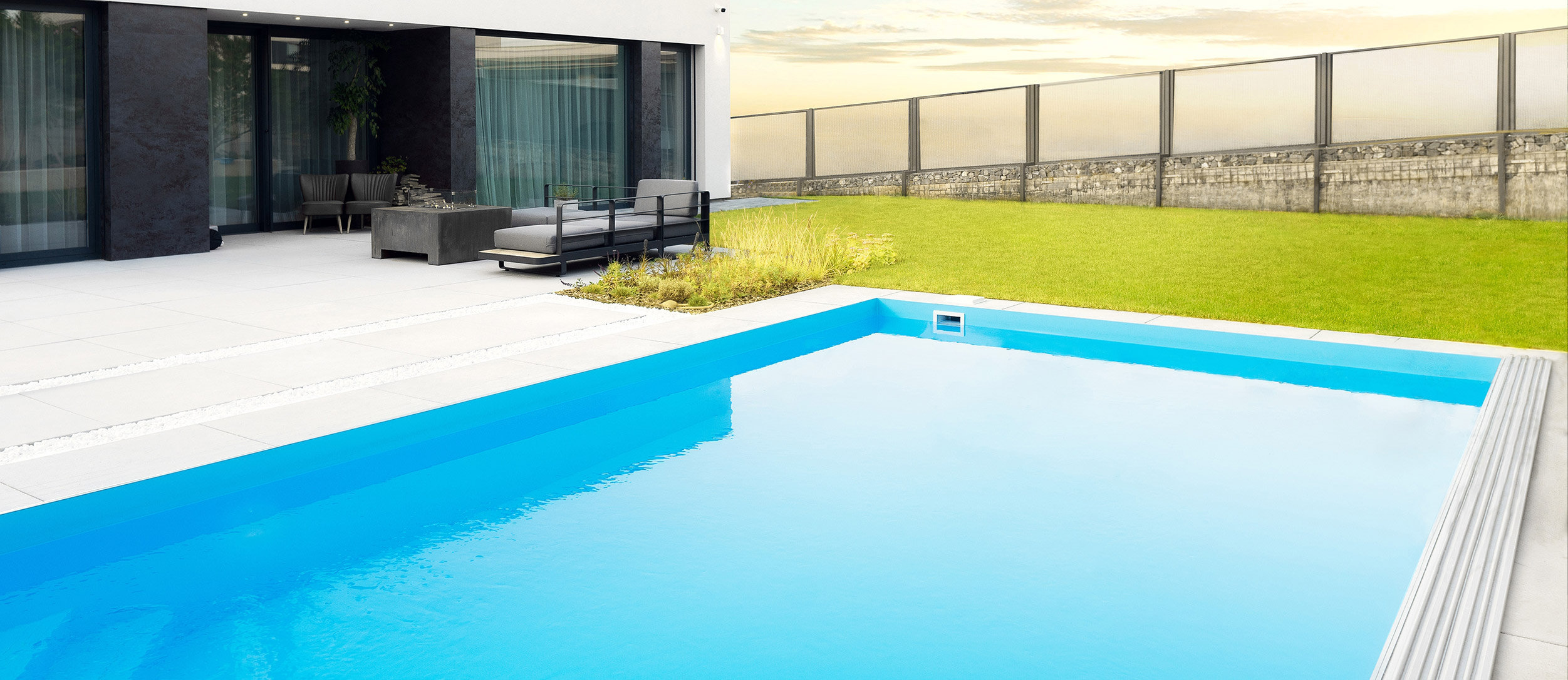 We manufacture skimmer pools from ALBISTONE® and POLYSTONE® which are high-quality materials, and were developed especially for pools, and excel in their long life, colour fastness and resistance to temperatures and chemicals. You can finish them off with an elegant X-SHAPE edging.